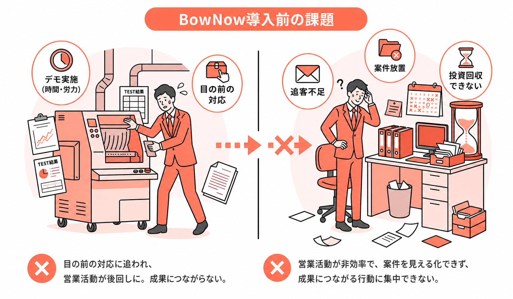 - デモ実施後の追客・クロージングが追いつかない:テスト結果が良好でも、そこから受注に至るまでのフォローに手が回らない