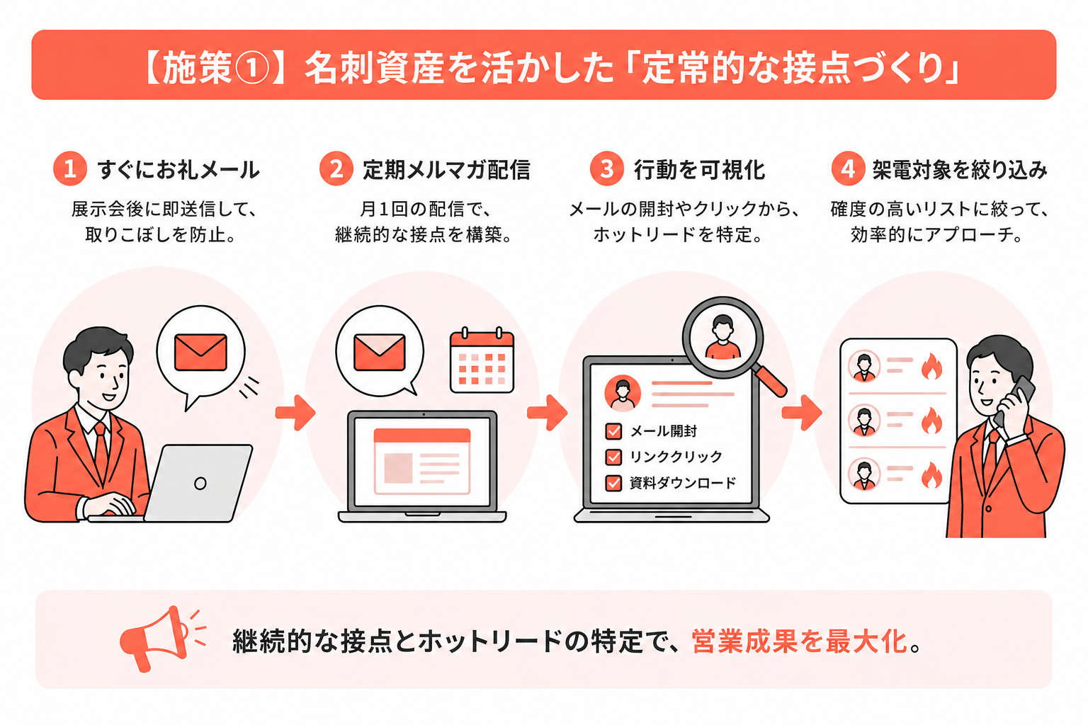 展示会来場者へ熱量が高いタイミングで即座にお礼メールを送り、取りこぼしを防止。月1回の定期メルマガを全名刺リストへ配信し、休眠顧客を含めた継続的な接点を構築しました。さらにメール開封やリンククリックなどの行動から「ホットリード」を特定。確度の高い見込み客リストとして可視化することで、架電対象を絞り込みました。