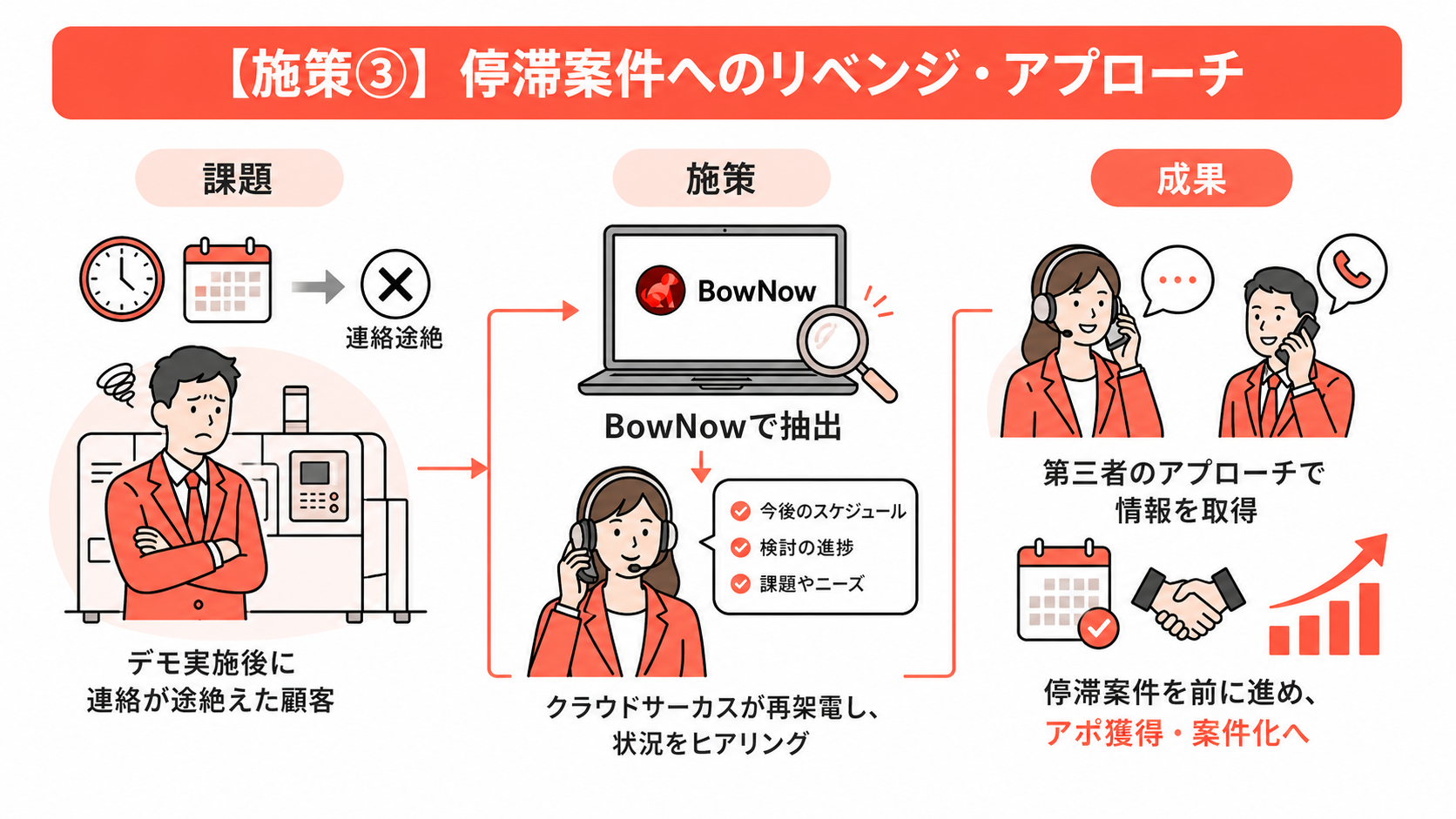 BowNowから、デモ実施後に連絡が途絶えていた顧客をピックアップし、クラウドサーカスが再架電を実施。堀様ご本人からではなく、第三者の立場で状況を確認することで、「今後のスケジュール」や「検討の進捗」など、直接は聞きづらい情報も引き出しやすくなり、停滞していた案件を前に進めることができました。