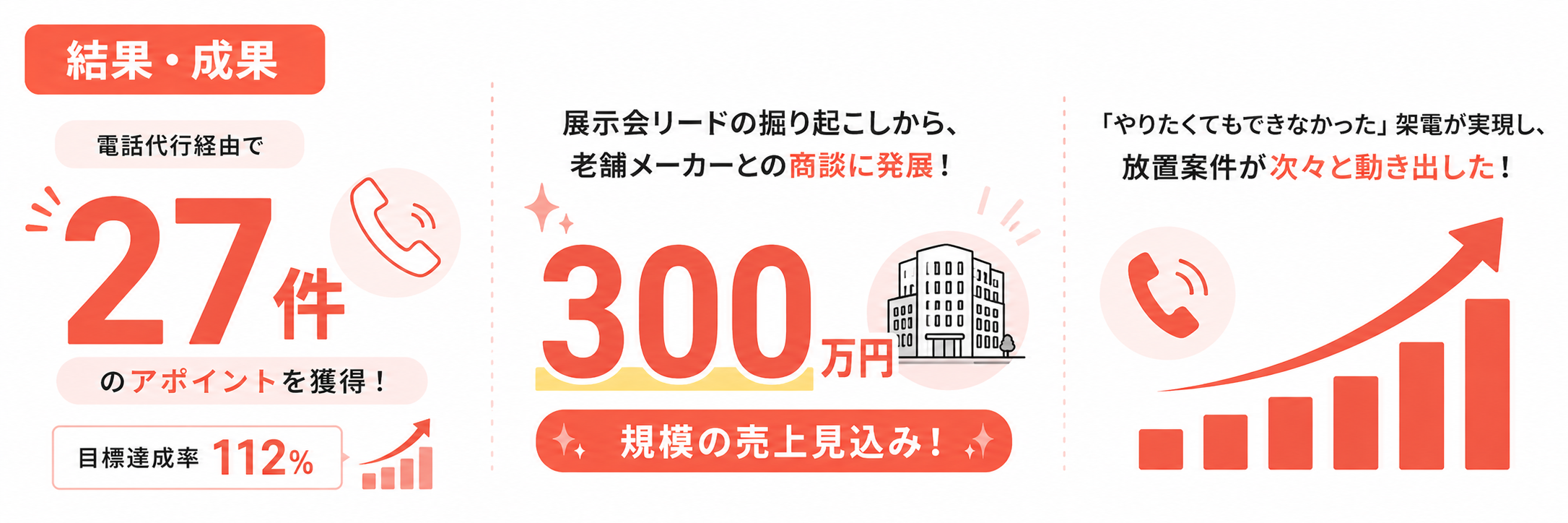 - 支援開始後、目標達成率112%(合計アポ数27件)を達成。老舗メーカーへの300万円規模の受注見込み(社長稟議中)を創出し、眠っていた名刺資産が着実に収益化されはじめている。