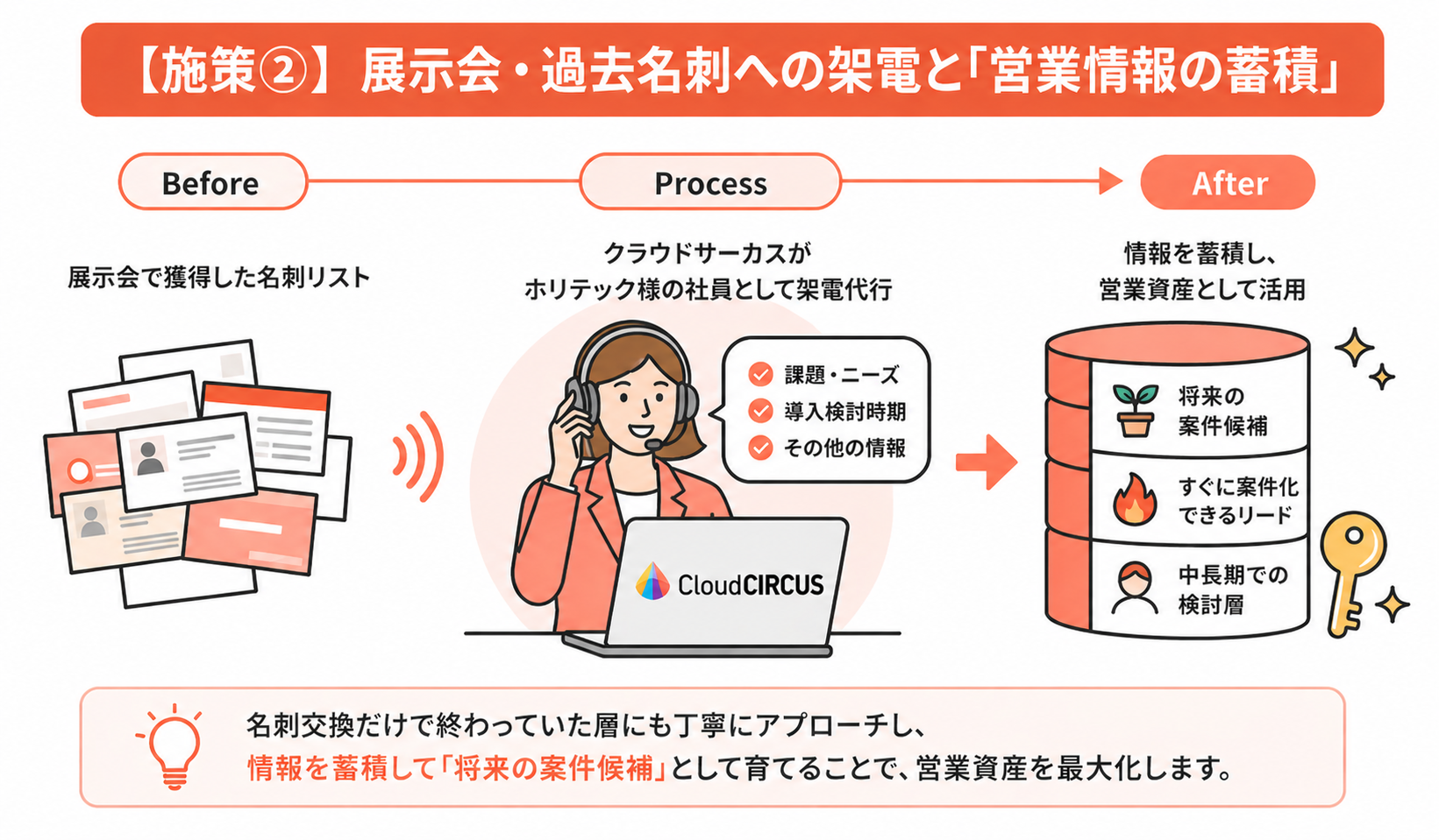 展示会で獲得した名刺リストに対し、クラウドサーカスがホリテック様の社員として架電を実施。これまで「名刺交換だけ」で終わっていた層に対して、現在の課題やニーズ、今後の導入検討時期などを深くヒアリング。すぐに案件化しない顧客であっても、情報を丁寧に蓄積することで、単なる名刺リストを「将来の案件候補」という価値ある営業資産へと育て上げました。