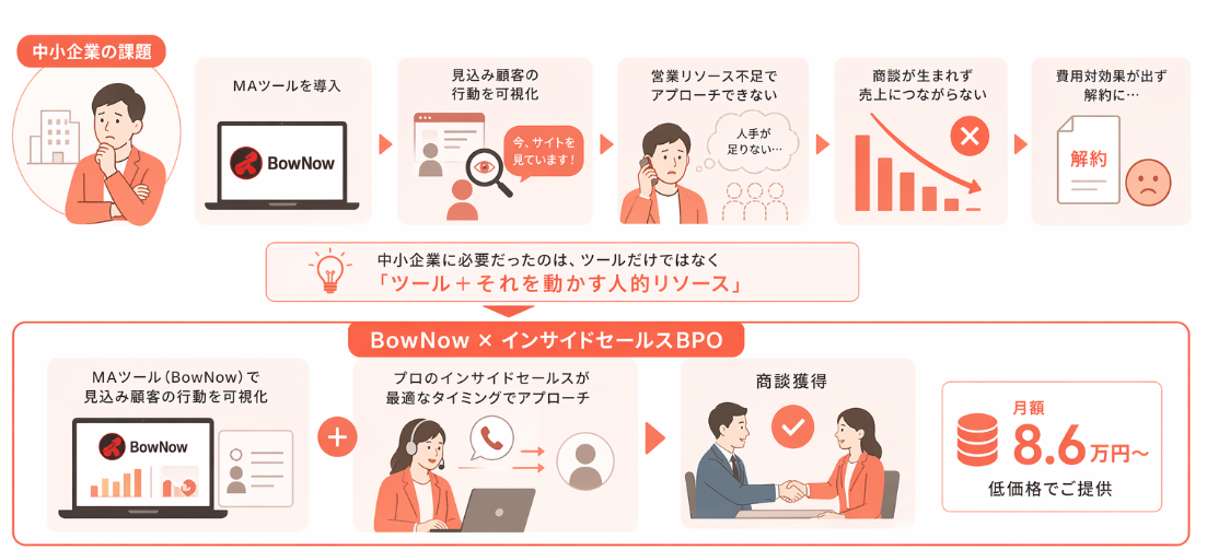 この課題を解決するために生まれたのが、BowNow×インサイドセールスBPOというサービスです。MAツールによる見込み顧客の行動データの可視化と、プロのインサイドセールス担当者による最適なタイミングでの架電・商談獲得を、ひとつのパッケージとして月額8.6万円からという低価格で提供しています。