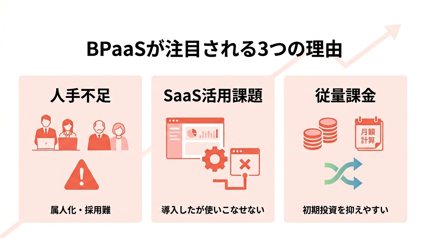 BPaaSがこれほど注目を集める背景には、人手不足・DXの停滞・コスト構造の変革という3つの構造的な要因があります。