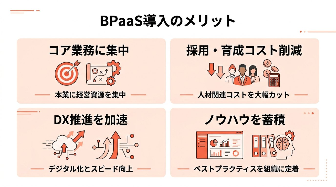 BPaaSの主なメリットは、コア業務への集中、コスト削減、DX推進の加速、ノウハウの社内蓄積の4点です。