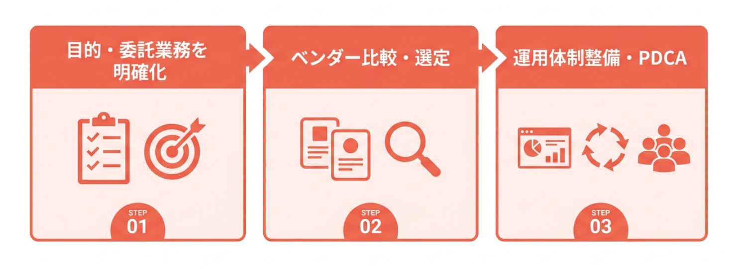 BPaaS導入は「目的の明確化→ベンダー選定→運用改善」の3ステップで進めるのが基本です。