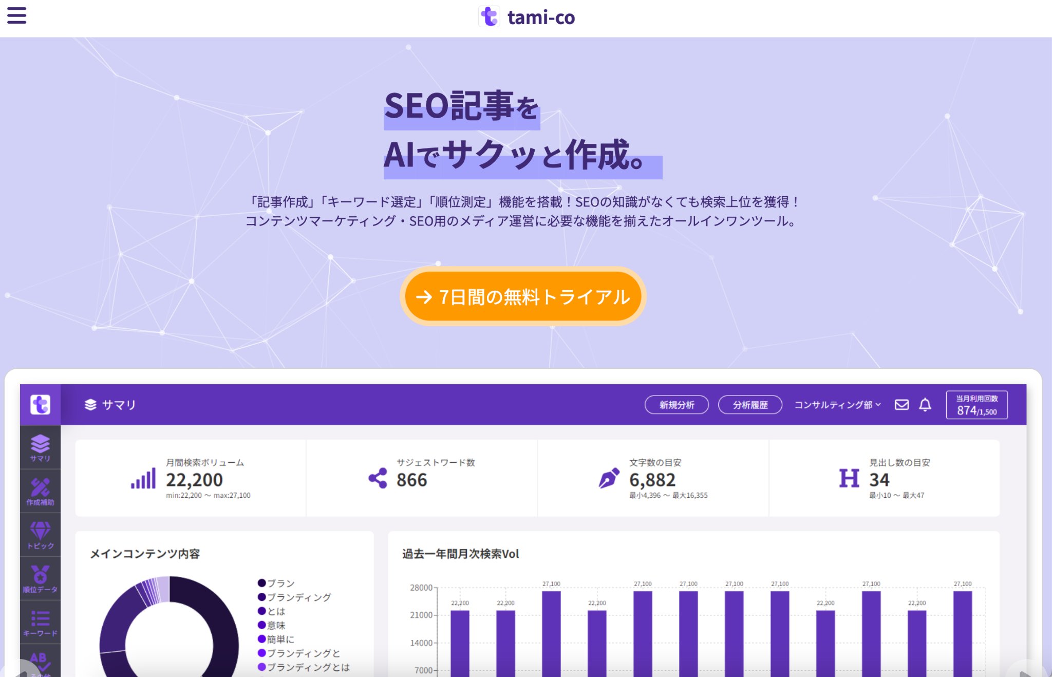 「tami-co」は、SEO対策とコンテンツプランニングを支援するツールです。キーワードの洗い出しや、タイトル・見出しに最適なキーワード提案を行い、SEO初心者でも上位表示を狙えるコンテンツを作成できます。