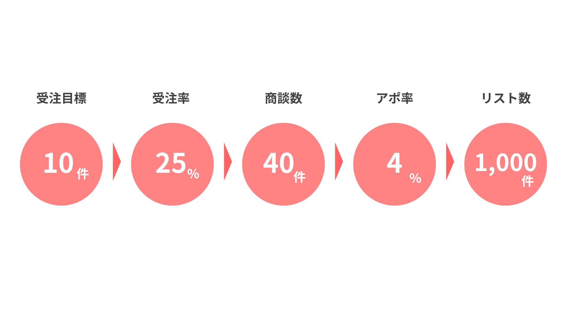目標とする売上やアポイント数から逆算して、必要なリスト件数と作成予算を計画します。例えば、月間10件の受注目標で商談からの受注率が25%なら40件の商談が必要です。さらにリストからのアポ率が4%であれば、最低1,000件のリストが必要という計算になります。
