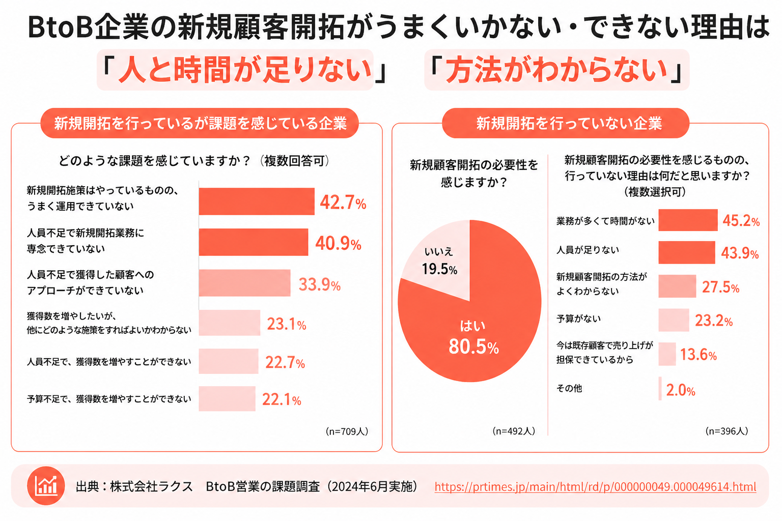 株式会社ラクスのBtoB営業の課題調査によれば、新規開拓に取り組む企業の多くが「人と時間が足りない」「方法がわからない」という根本的な悩みを抱えています。さらに、人手不足を背景に倒産する企業も増加傾向にあり、「優秀な営業担当者を増やして新規開拓を強化する」という従来型の解決策が成り立ちにくくなっています。