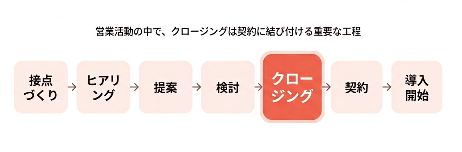 クロージングは、契約をまとめる最後の行為であると同時に、長期的な関係構築の出発点として営業活動全体を支える役割を担っています。