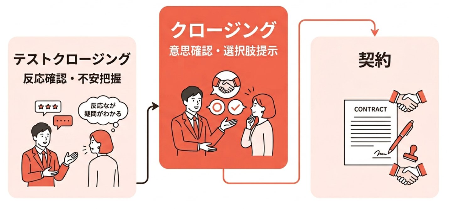 テストクロージングとは、提案後の顧客の反応を確かめるステップです。価格や導入時期、運用体制といった論点について質問を投げかけ、理解度や不安を言語化してもらいます。