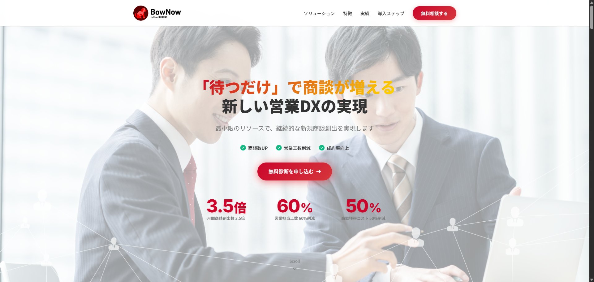 クラウドサーカス株式会社が提供する「BowNow×インサイドセールスBPO」は、国産MAツールシェアNo.1の「BowNow」による見込み顧客の自動可視化と、プロによる架電代行をセットにしたサービスで、月額8.6万円から利用できます。