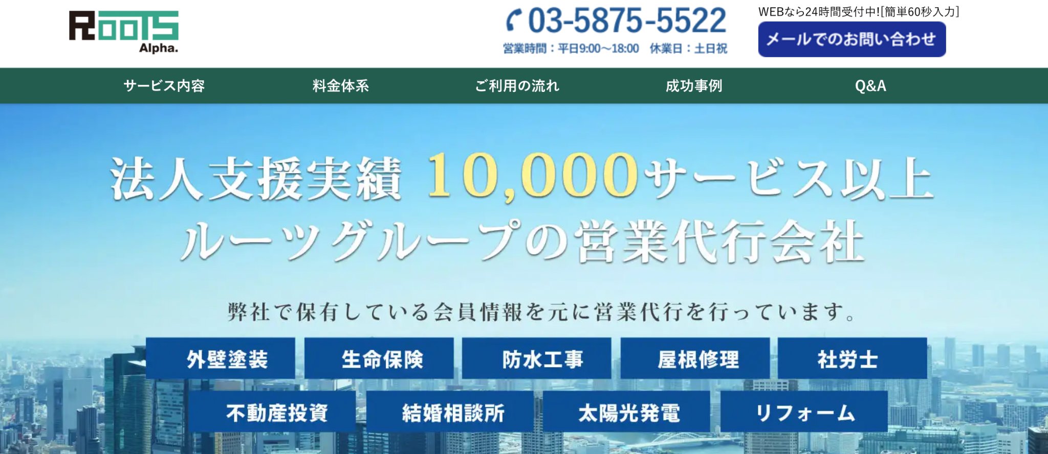 | ルーツアルファ | 1アポ1万円〜 | BtoC・BtoB | 業界最安水準の単価と幅広い業種対応 |