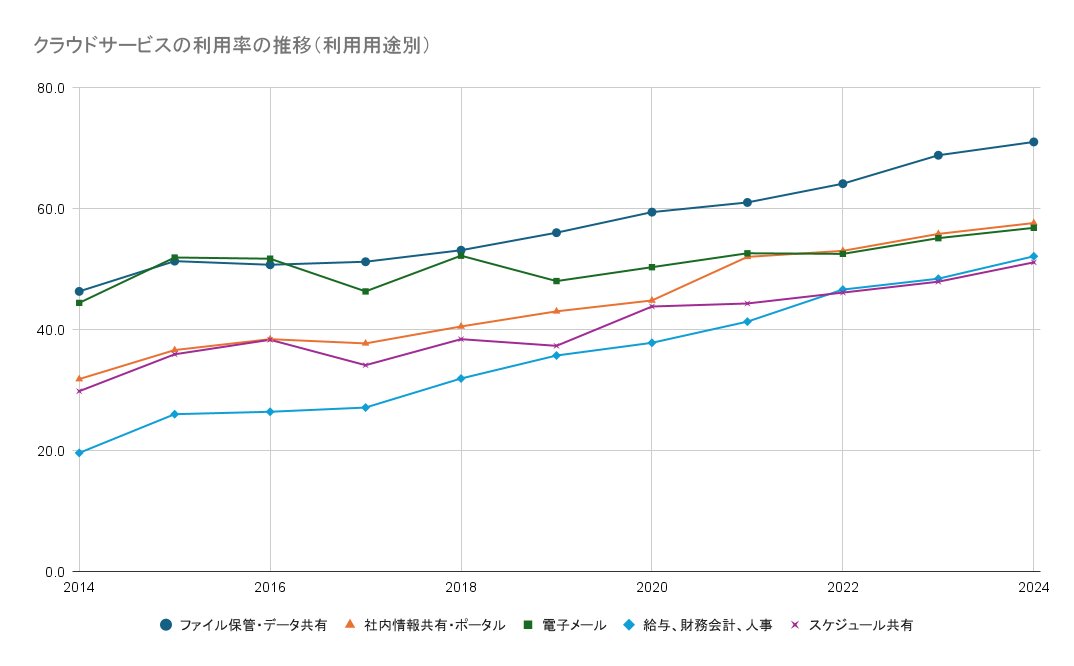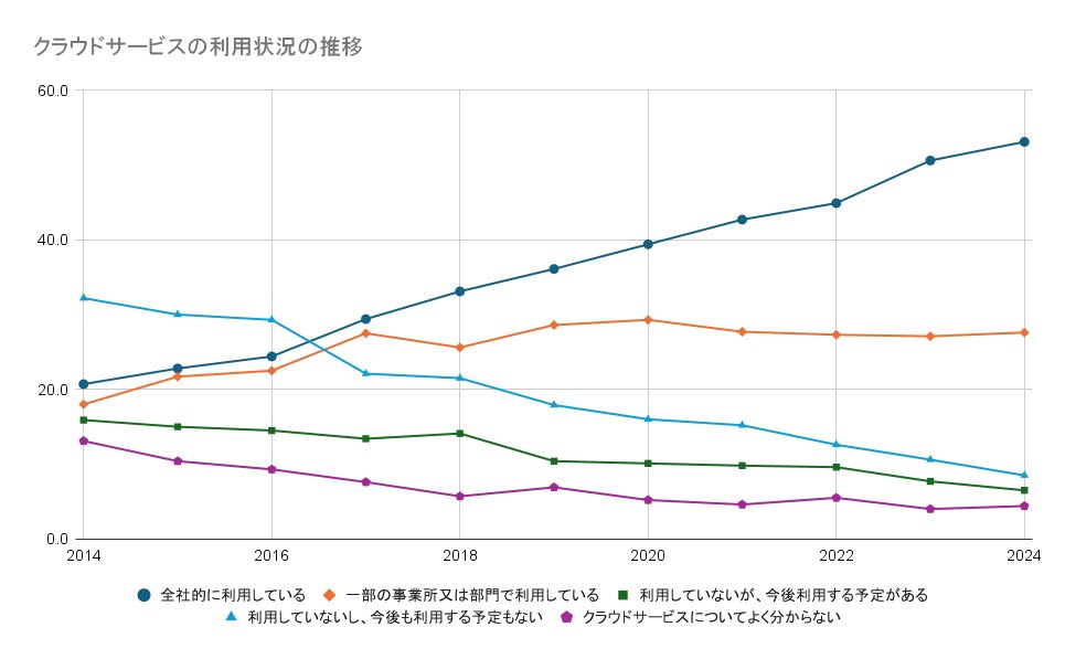 総務省の「令和7年版 情報通信白書」によると、クラウドサービスを利用する企業の割合は年々増えており、「全社的に利用している」と「一部の事業所又は部門で利用している」という企業は、2024年には80.6%の企業に達しました。