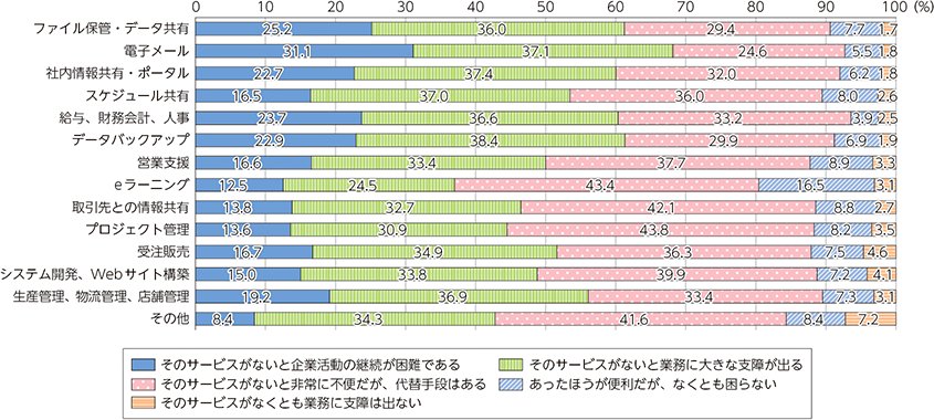 結果として、「サービスがないと企業活動を継続できない」「業務に大きな支障が出る」と回答した割合が高いサービスには、「電子メール」「ファイル保管・データ共有」「社内情報共有」「給与・財務会計・人事」などが挙げられました。