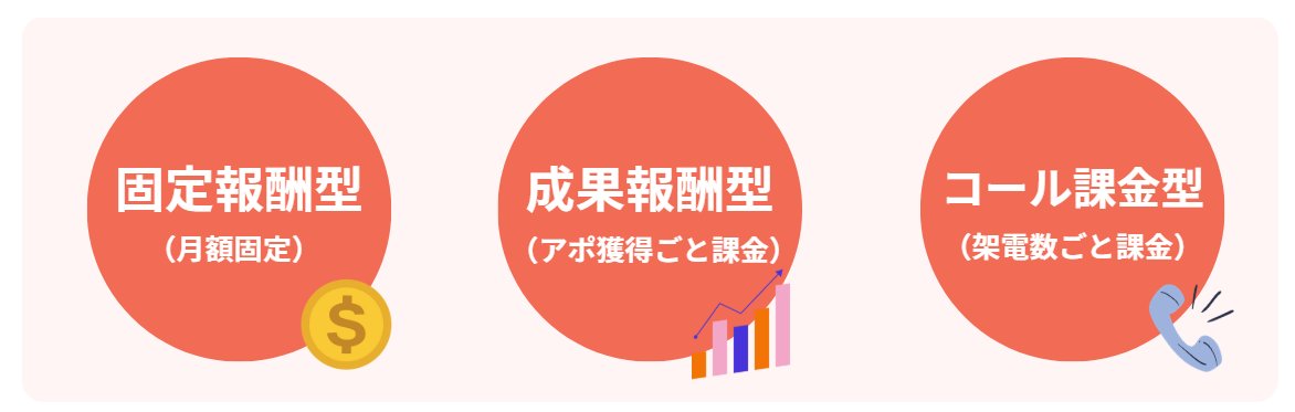 | 費用相場 | 月額20万〜200万円 | 1アポ5,000〜80,000円 | 1コール100〜300円 |